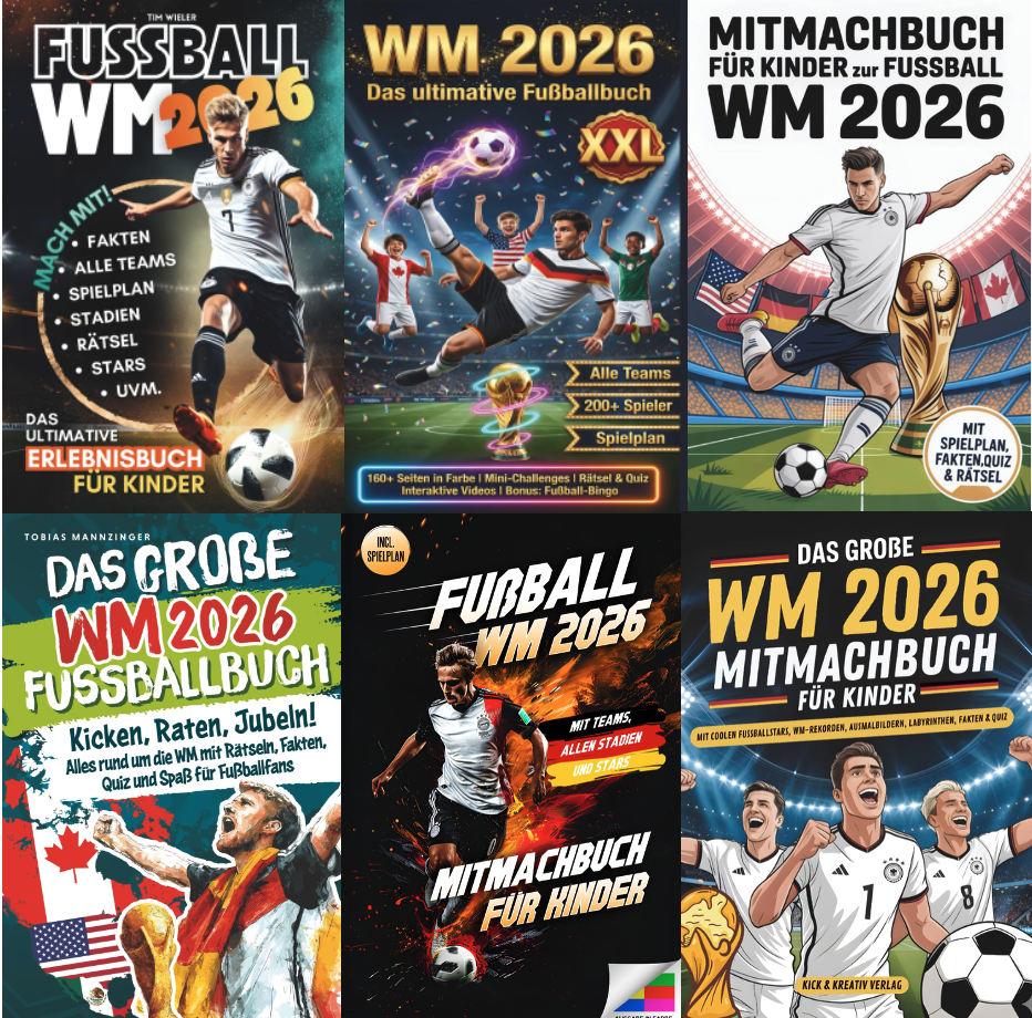 Kick it! Das Ultimative WM 2026 Fußballbuch. Alles rund um die Weltmeisterschaft unterscheidet sich um nichts von den bisherigen. Ein Verlag ist aber genannt, der Wamika Verlag aus Leipzig. Mit 10 Titeln im Programm, die alle KI-gebastelt sind. Und der Bestseller-Status kommt von Nr. 1 in Reisen zu Sportveranstaltungen.
